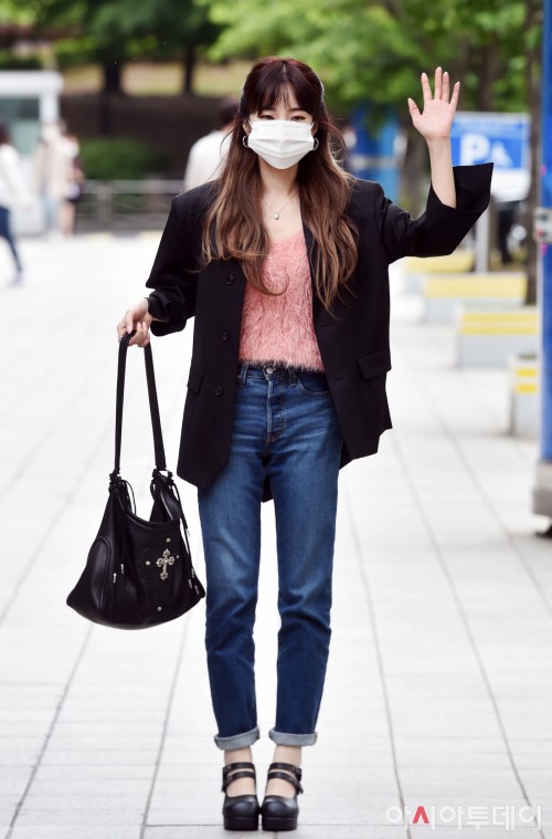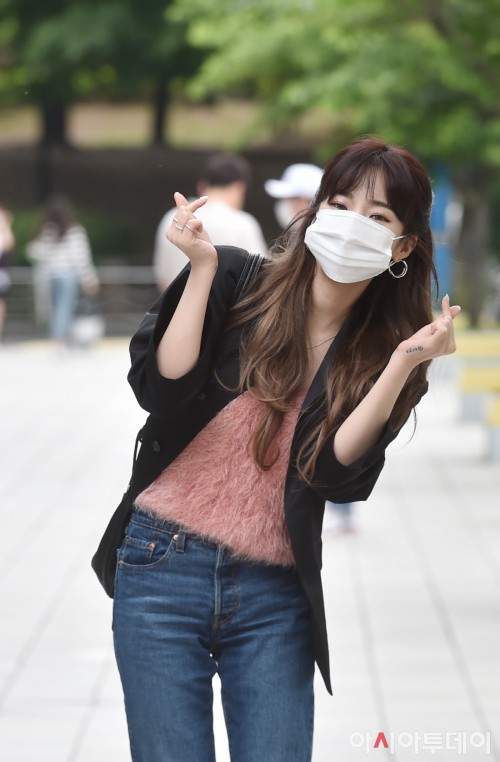 5月20日下午,歌手Heize现身首尔木洞SBS本部大楼前,准备参与一档节目的录制。