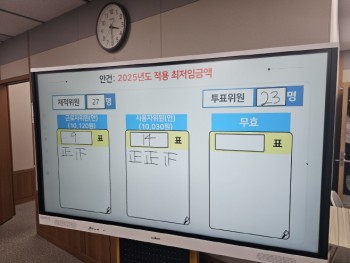 | 12日凌晨,召开第11次全体会议的政府世宗大厦最低时薪委员会会议室显示器上显示的2025年度最低时薪额投票结果 |