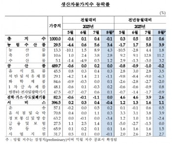 农产品和畜产品分别上涨了4.3%和2.8%,农林水产品生产者物价指数上涨了3.4%。 工业品、电力、煤气、自来水及废弃物虽然比前一个月保持平稳势头,但服务特别是信息通信及广播服务下降3.4%,事业支援服务下降0.1%,抵消了农林水产品的上升幅度。