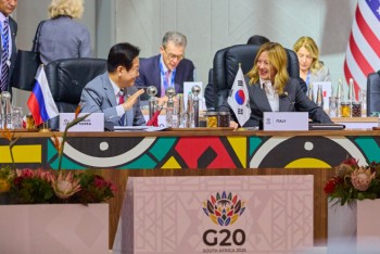 | 22日(当地时间),在南非共和国纳斯雷克博览中心举行的二十国集团(G20)峰会上,李在明总统正在与意大利总理梅洛尼对话/韩联社 |