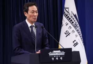 | 为参加6·3地方选举江原道知事选举而辞职的政务首席秘书禹相虎18日在青瓦台向记者们致辞/韩联社 |